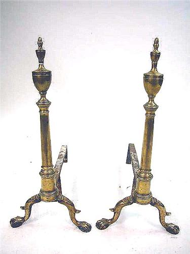 A GOOD PAIR OF CAST BRASS URN-TOP ANDIRONS; possibly Philadelphia, lacking log-stops, 23"h x 11"w x 19"d