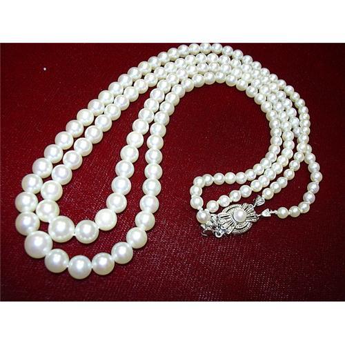 THIS IS A TWO STRING PEARL NECKLACE. IT IS VERY ELEGANT AND BEAUTIFUL. THE PEARLS ARE CREAM COLOR AND ARE IN A GREAT CONDITION. THE NECKLACE IS FINISHED WITH A LOVELY 14K WHITE GOLD CLASP DECORATED WITH A PEARL - 3/16" DIAMETER.