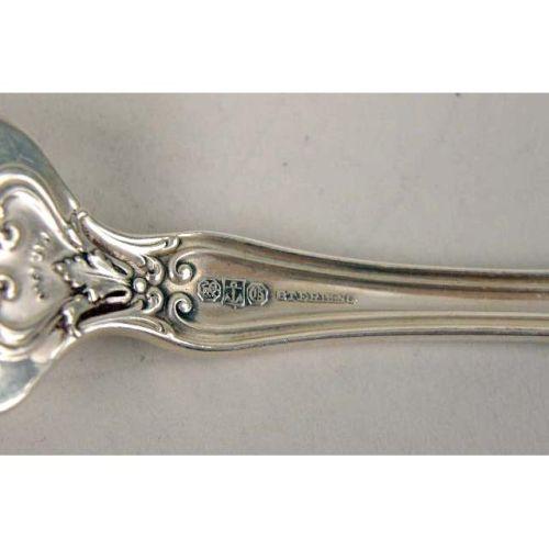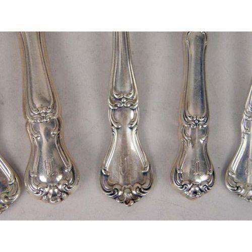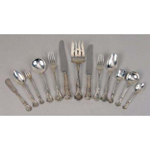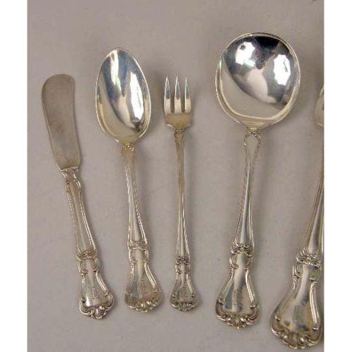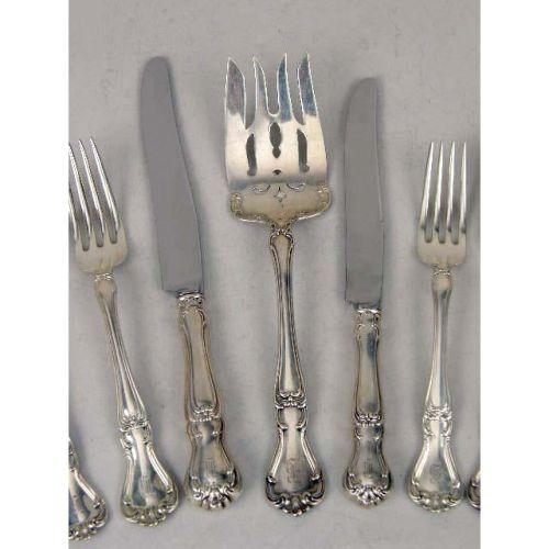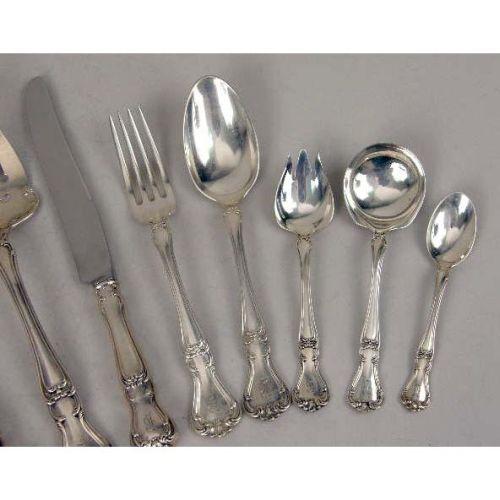 A GORHAM "CHANTILLY" PATTERN (1895) STERLING SILVER FLATWARE SERVICE<BR><BR>With "B` monograms, comprising 8 dinner knives & forks, 12 luncheon knives 7 11 forks, 8 salad forks, 8 flat-handled butter spreaders, 8 cream soup spoons, 8 bouillon spoons, 8 place spoons, 8 ice cream forks, 12 teaspoons, 8 seafood forks, 7 demi-tasse spoons, 1 cold meat fork, and 1 cake server, total weight apx. 110 T.O. weighable, 116 pieces