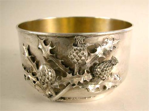 A GORHAM & CO STERLING SILVER CIRCULAR "THISTLE" BOWL; vermeil wash interior, with applied thistle form leaves and flowers, 4 1/2"dia., apx. 9 T.O.