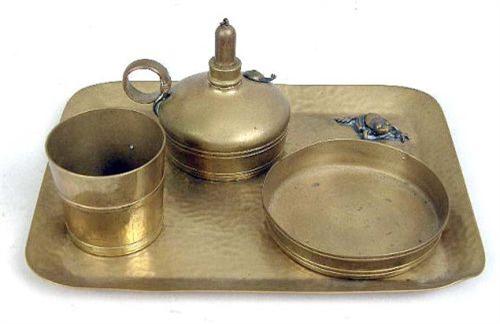 Numbered V16-V19, comprising a hand-hammered rectangular tray with curved corners and applied copper frog, 7-3/4" x 6-1/4", a coaster, 3-1/4"dia., a ribbed cylinder, 1-7/8"h, possible missing element, and a lamp, 3"h with applied copper snail