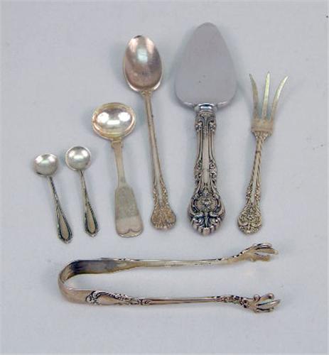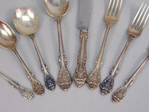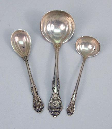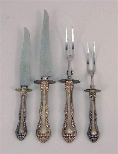 Comprising twelve each dinner and luncheon knives and forks, cream soup spoons, salad forks, teaspoons, iced tea and demi-tasse spoons, ten flat handled butter spreaders, three hollow-handled butter spreaders, four tablespoons, one sauce ladle, one cream ladle, one sugar tongs, two condiment spoons, a cheese knife, and two two-piece carving sets, total weight apx. 132 T.O. weighable. Dinner knives 9 1/2"l
