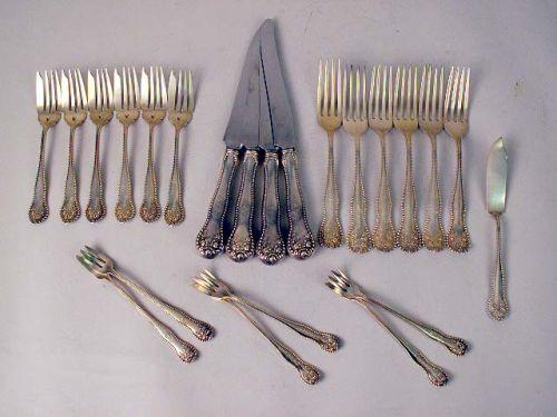 Rose motif, comprising six each cocktail forks, dessert forks, and place forks, four place knives, and a master butter knife. Total weight approximately 18 T.O. weighable. 23 pieces.