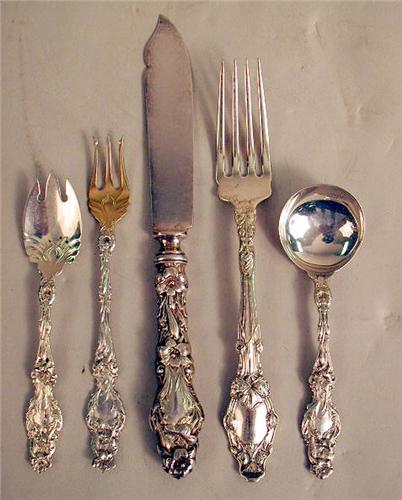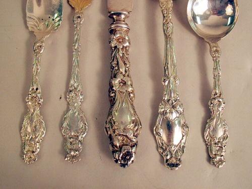 Comprising twelve fish knives, six dinner forks, twelve seafood forks, twelve ice cream forks, and twelve bouillon spoons.