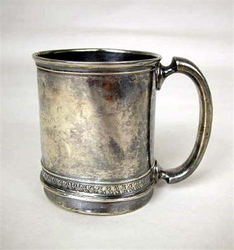 A GORHAM STERLING SILVER BABY CUP, engraved "Mary Woodward Metzger", April 21, 1884, molded rim, chased leaf motif around base, split and dented, marked with old Gorham mark 3103, 3"h