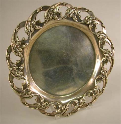 A GORHAM STERLING SILVER CIRCULAR TRAY; With open scrolled border, #A1213M, three letter scroll monogram, 12-1/2" dia., apx. 23 T.O.