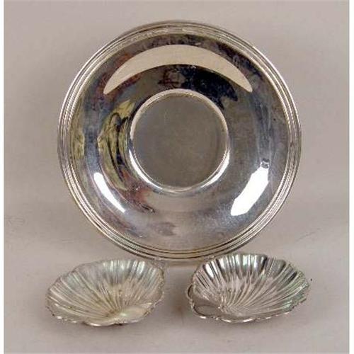 A GORHAM STERLING SILVER CIRCULAR TRAY<BR><BR>With molded border, 10"dia., together with a pair of American sterling silver shell-form bonbon dishes, each 4-3/4"dia., total weight 18 T.O.