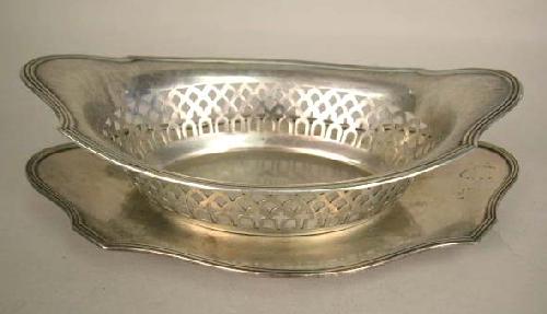 A GORHAM STERLING SILVER OVAL RETICULATED SIDE BOWL; With reeded border, three letter scroll monogram, #A7976, together with a Gorham sterling silver similar pattern tray, #A2803, monog., total apx. 9 T.O.