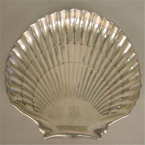 A GORHAM STERLING SILVER SHELL-FORM DISH; With three letter scroll monogram, on two ball feet, #40617, 9"l, apx. 15 T.O.