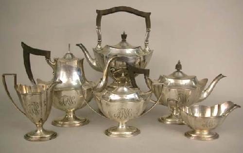 A GORHAM STERLING SILVER SIX PIECE TEA AND COFFEE SERVICE; On oval footed base, Chippendale style with reeded acanthus form handles, three letter scroll monogram, comprising: a hot water kettle on stand, coffee pot, 9"h, missing wooden finial, teapot, covered sugar bowl, cream jug, and milk jug, #A2780, apx. 112 T.O.