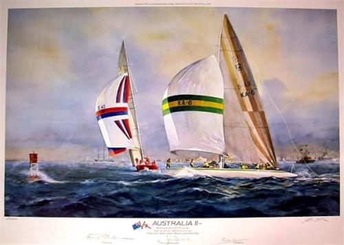 A GOUACHE ON BOARD OF THE SAILING SHIP "SAGA"; Signed LR Lester Fagan's, 35 25"h x 16"w (losses) Together with a colored lithograph of Australia II, signed by all crew members defeating Liberty USA 1983