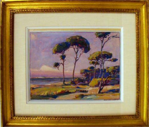 Karl Schmidt, titled "Tall Trees on Beach". Provenance: Estate of the Artist Randall Galleries, LTD., New York, sale January 30, 1980. 8"h x 12"w.