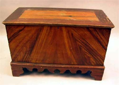 A GRAIN-PAINTED PINE DIMINITIVE BLANKET CHEST; Berks County, Pennsylvania, with a locking till drawer, elaborate apron and tall feet, some wear and repairs, 24"h x 37 1/2"w x 19"d