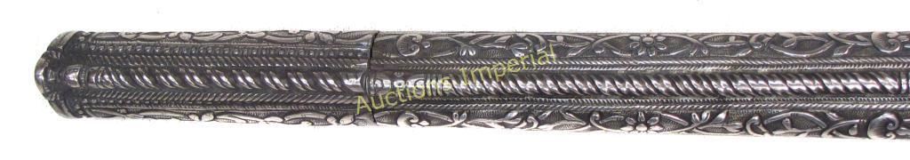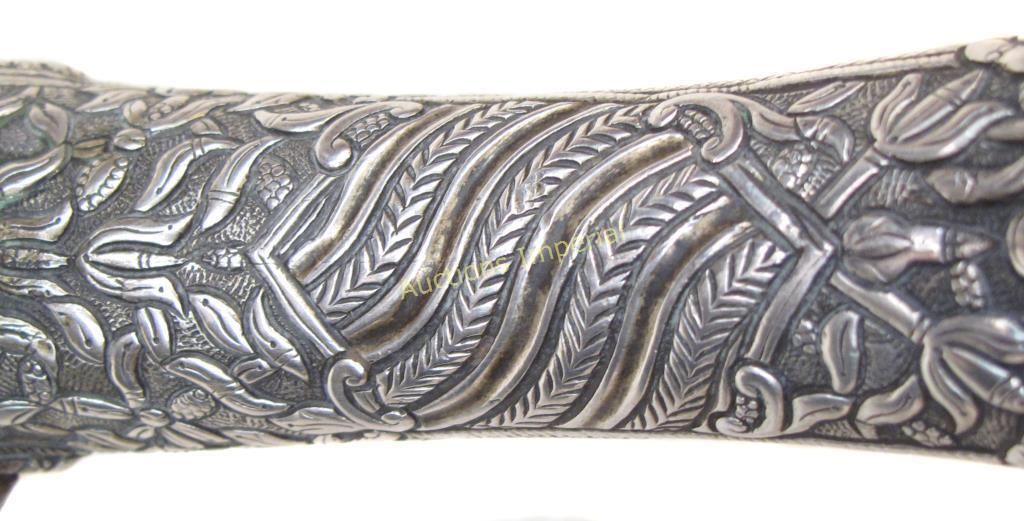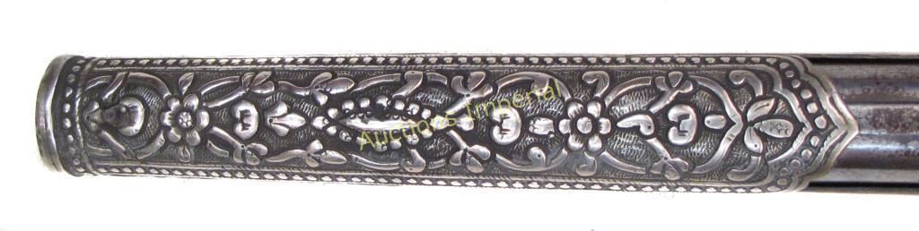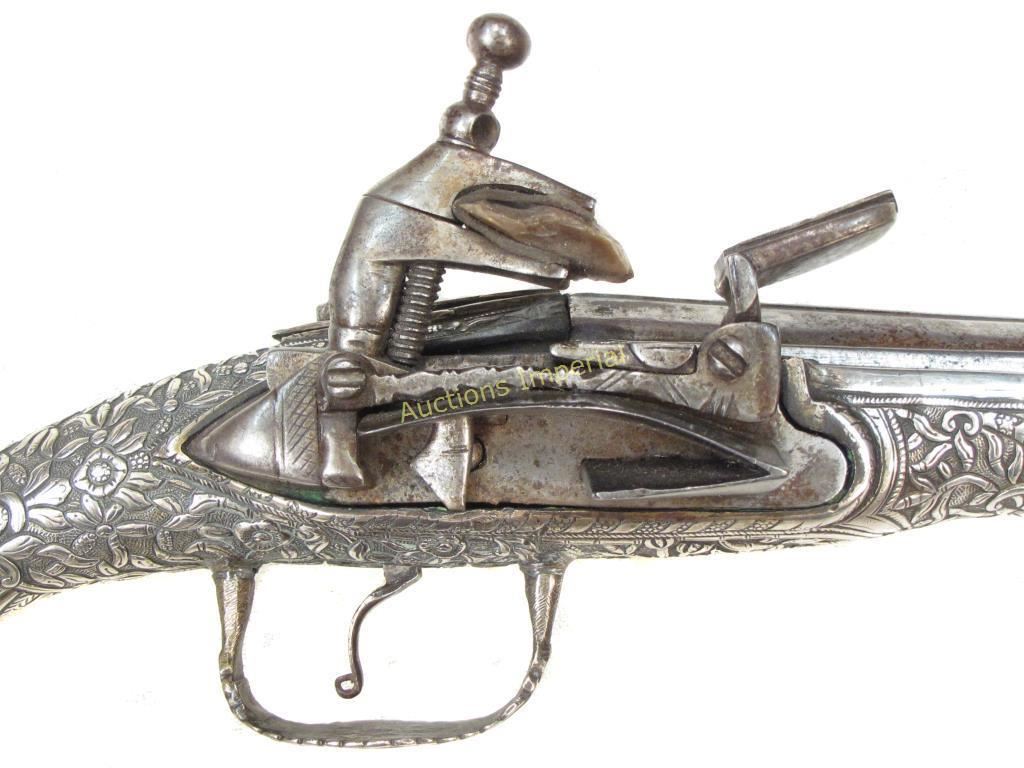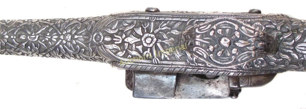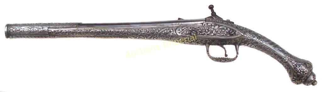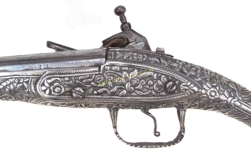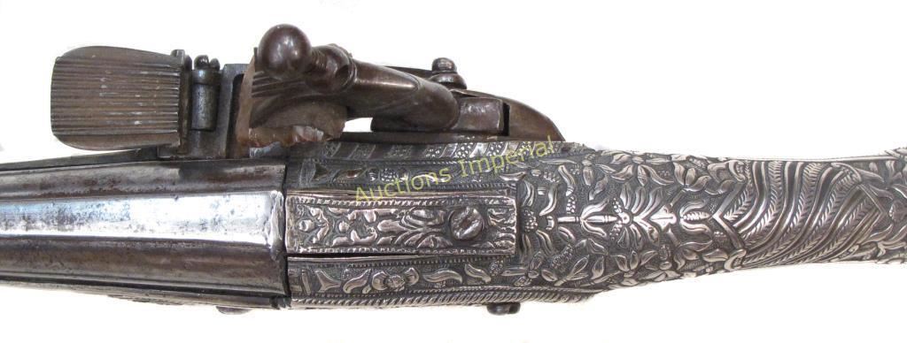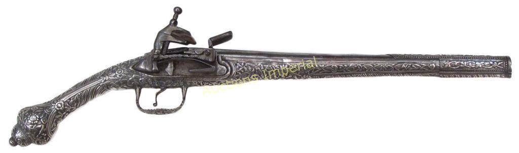 An unusually fine example, likely Epirus work. The entire stock of silver, chiseled, embossed and engraved overall, in intricate baroque motifs involving flowering vinework and stands of arms. The miquelet lock with profiled borders. With octagonal barrel. Late 18th-early 19th century. Light wear. Overall length 51.7 cm.