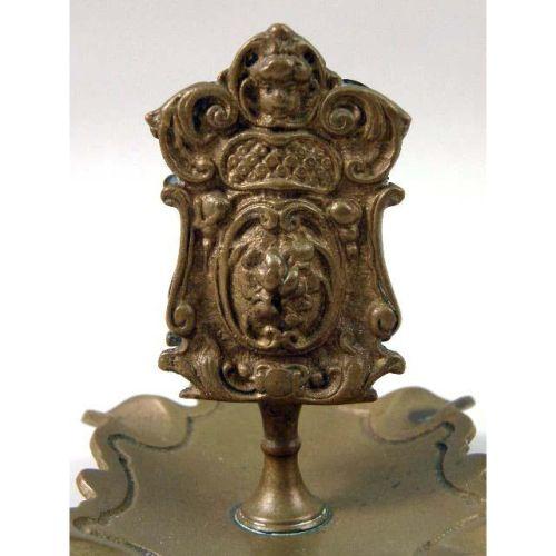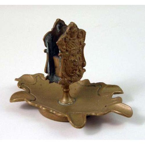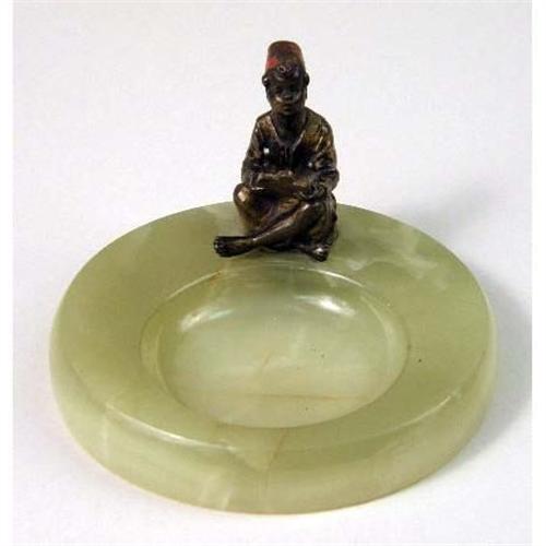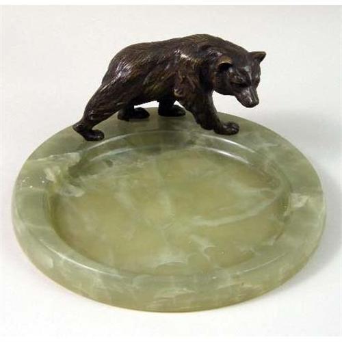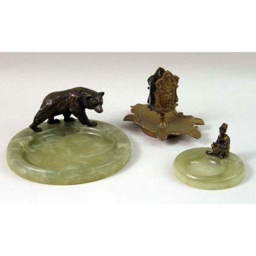 A GREEN HARDSTONE ASHTRAY<BR><BR>Mounted with a patinated metal bear. Together with a similar ashtray mounted with a figure of a seated boy and a brass cigar ashtray, wear, From 4-1/4"dia to 8"dia to 8"l, 3 pieces