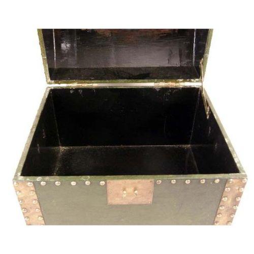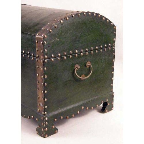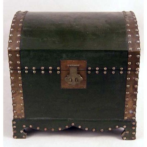A GREEN-LEATHER AND BRASS TACK-MOUNTED DOME TOP CHEST<BR><BR>Interior painted at a later date, losses, 15"h x 15-3/4"w x 12-3/4"d