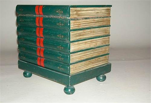 A GREEN PAINTED AND PARCEL GILT DECORATED BOOK FORM OCCASIONAL TABLE; 18" x 18" x 14"