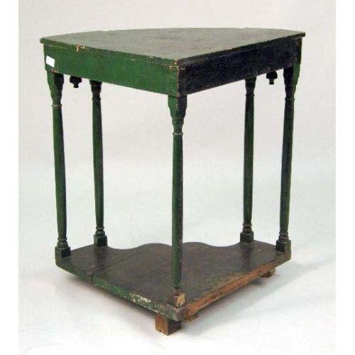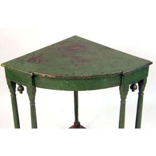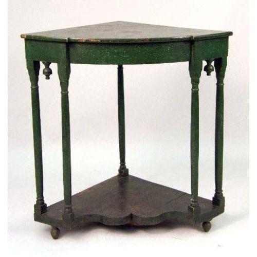 A GREEN-PAINTED TRIANGULAR CORNER TABLE<BR><BR>34" h x 33 1/2" w x 23 3/4" d.