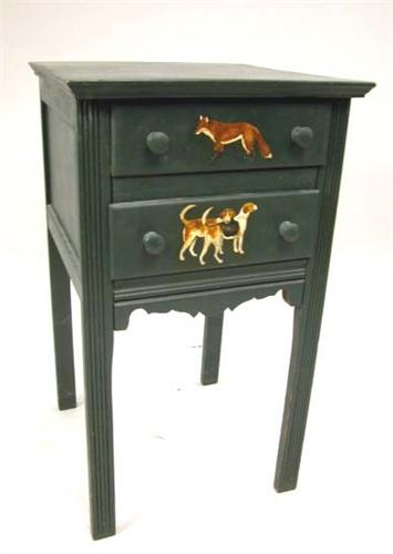 A GREEN-PAINTED TWO-DRAWER END TABLE; The drawers painted with a fox and two hounds, with a shaped apron below, ending on rectangular reeded legs 27 1/2"h x 15 1/2"w x 15 3/4"d