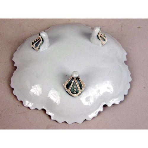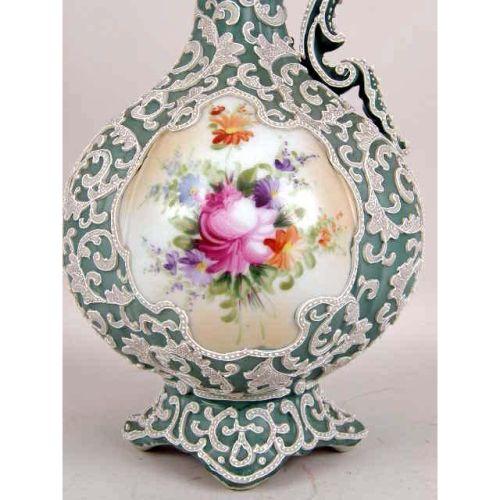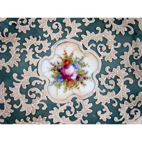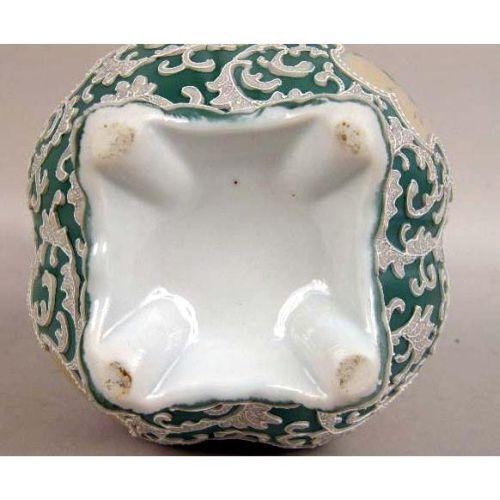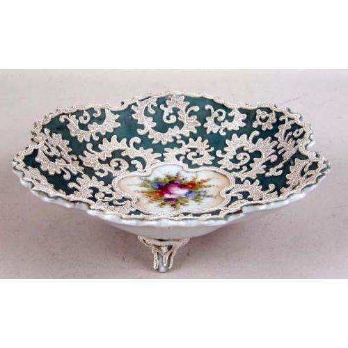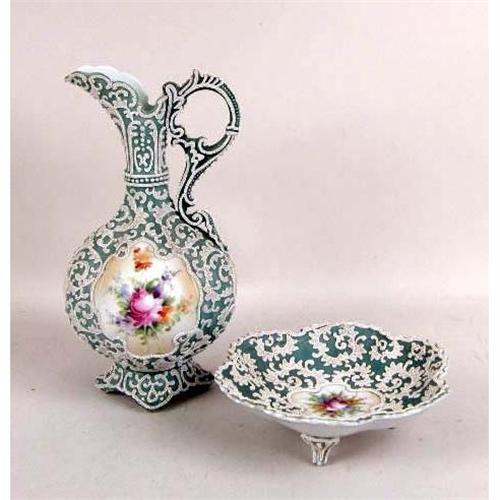 A GREEN PORCELAIN EWER<BR><BR>together with a footed dish, both with raised scroll motif and central floral medallions. Wear. 11"h