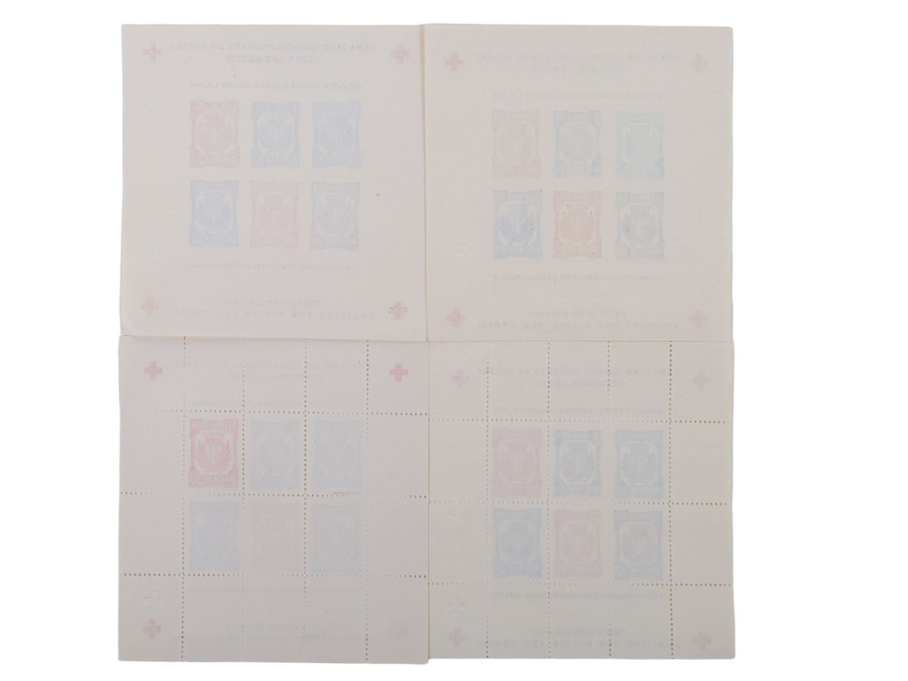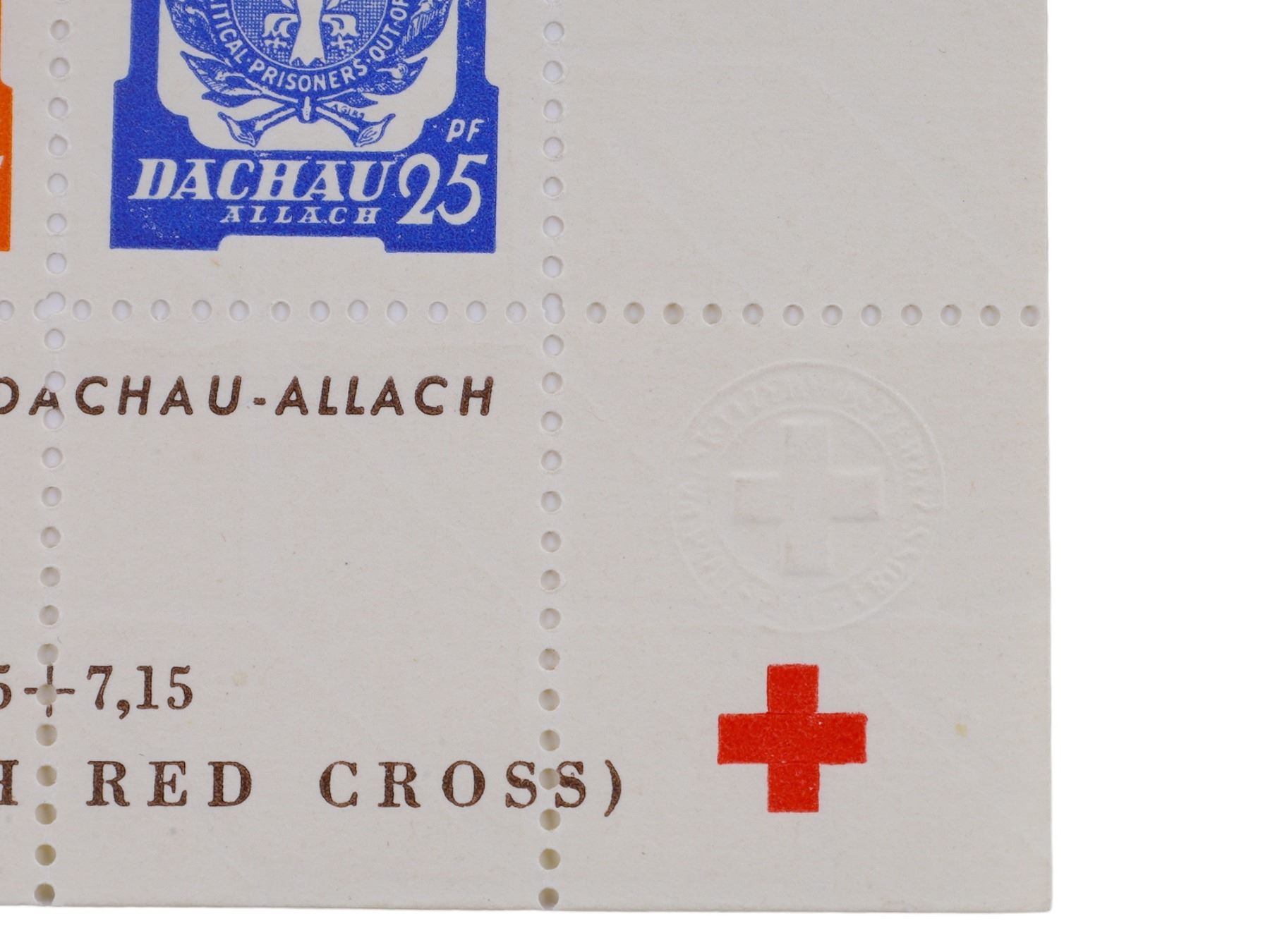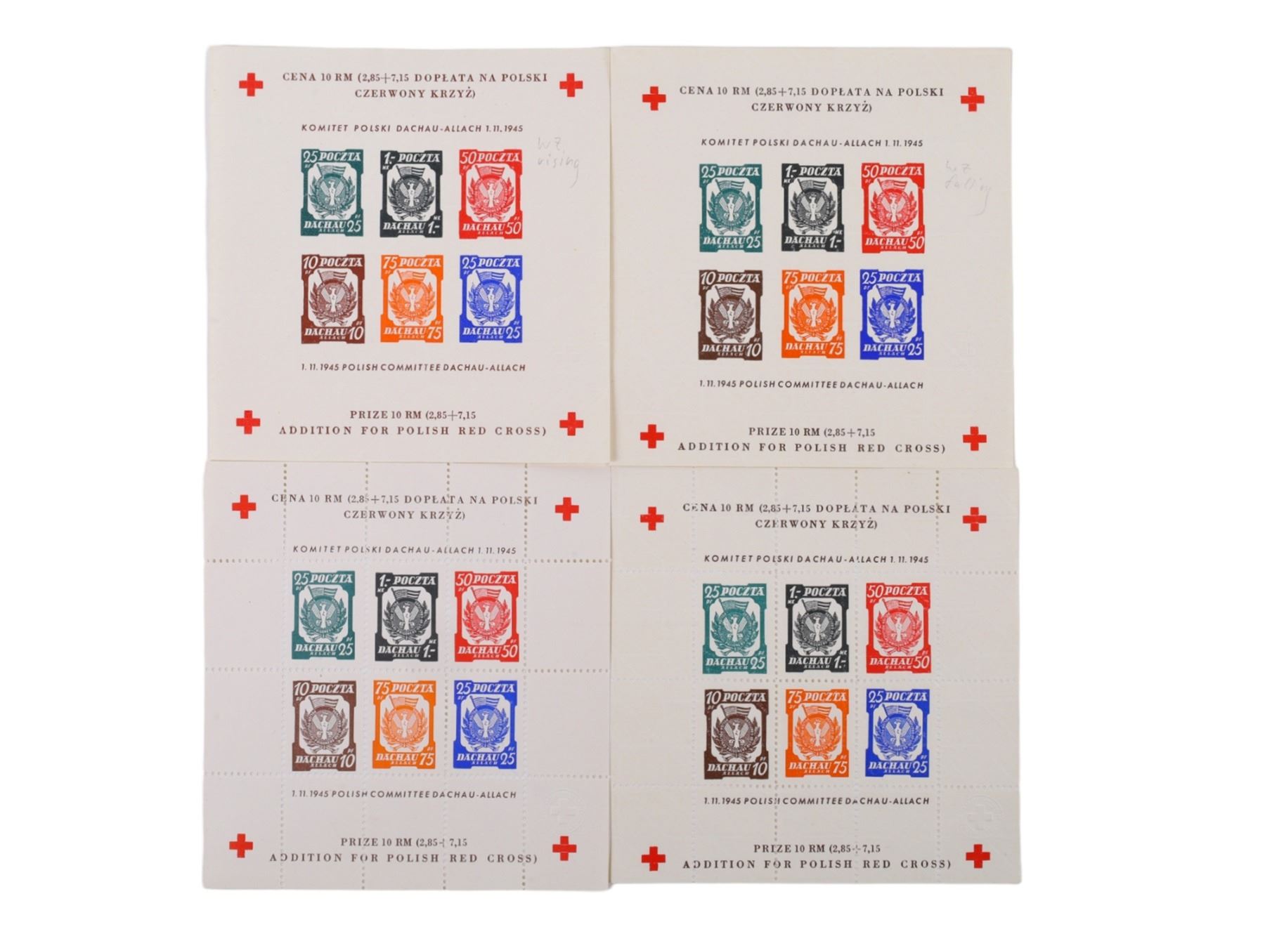 Six sheets of postal stamps issued 1.11.1945 by the Polish Committee Dachau Allach with addition for the Polish Red Cross stamps. The eagle in the center of the stamp has the words 'Polish Political Prisoners Out-of-Gratitude' surrounding it. These were issued at the end of WWII by the Polish Committee Dachau-Allach to raise funds for the Red Cross in that organization's efforts to locate missing persons. The Dachau Concentration Camp was liberated by the U.S. Army in April, 1945, after which the camp was used to house displaced persons. Poles at the camp organized their own postal service in August 1945.