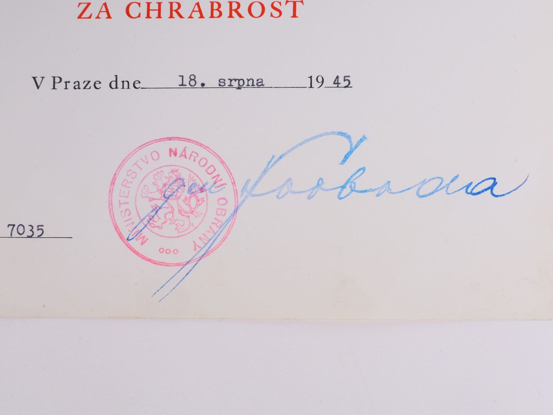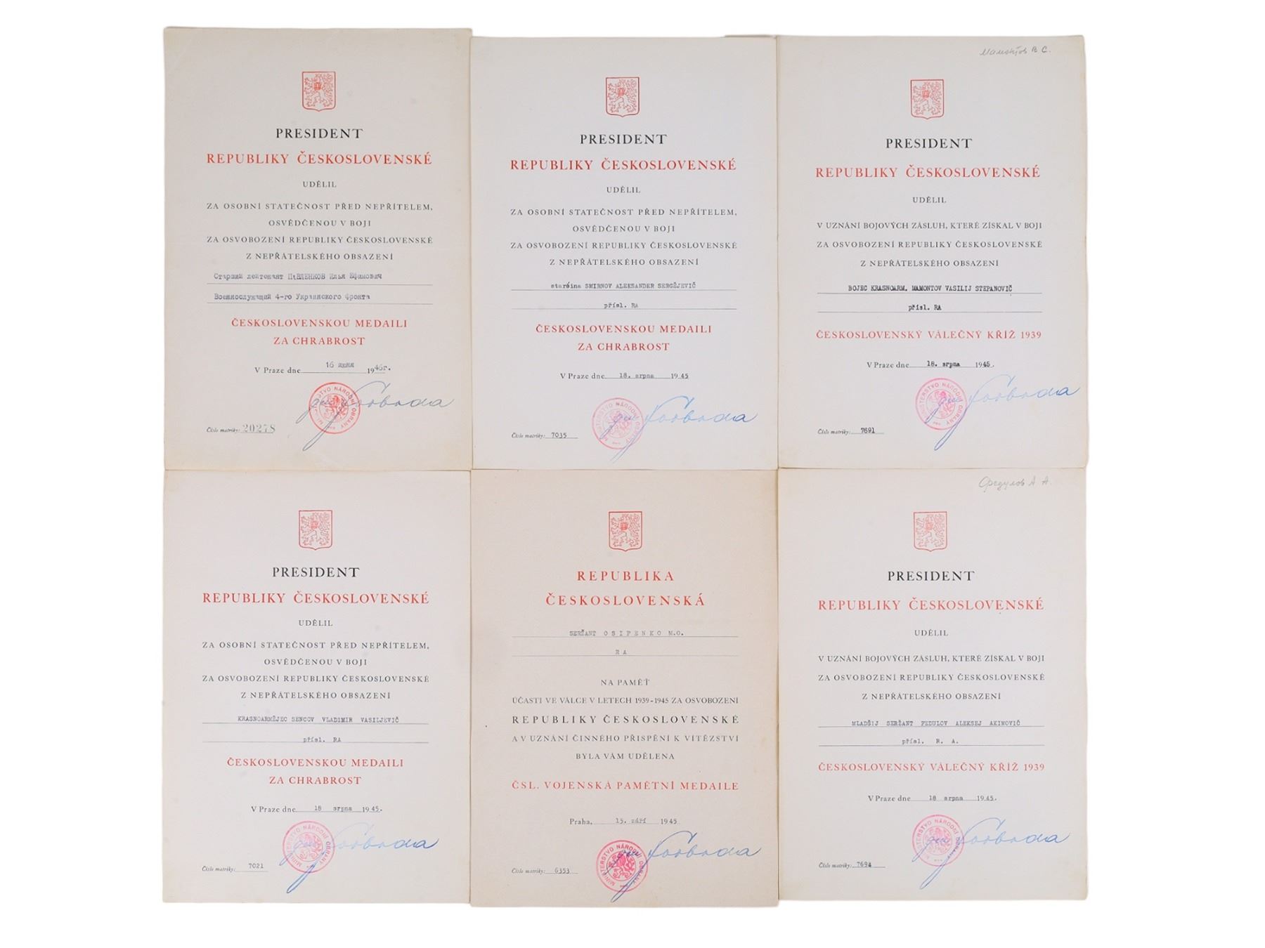 Six Czechoslovakian award citations for various awards, issued by Ludvík Svoboda to various Red Army personnel. All citations were issued between 1945-1946. Each document has the signature and handstamp of Svoboda at its bottom.
