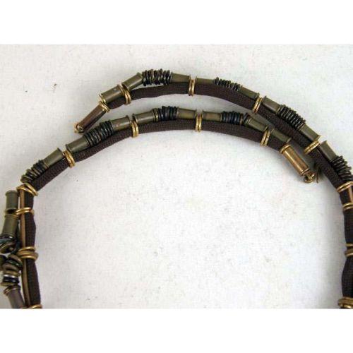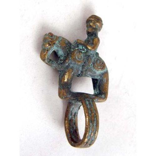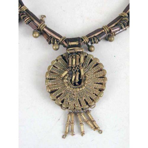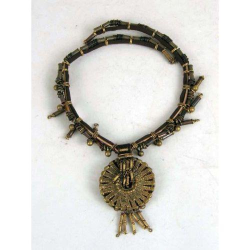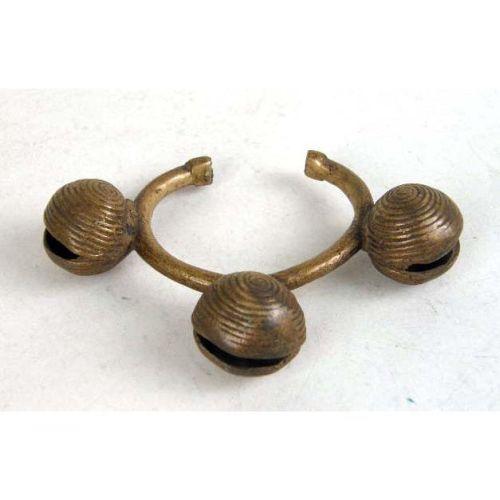A GROUP OF AFRICAN HAND-WROUGHT BRASS JEWELRY<BR><BR>Comprising a necklace with center circular pendant, a cuff bracelet with three cast bells, and a figural ring, necklace apx. 30"long