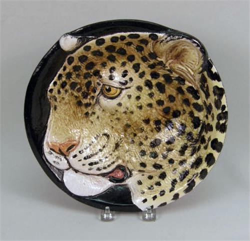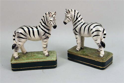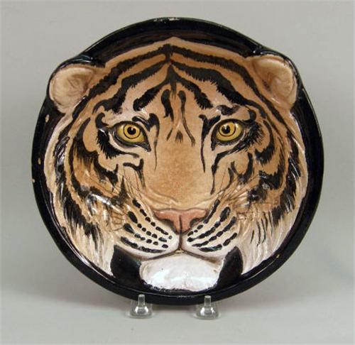 Comprising four Italian bowls depicting, variously, a lion, zebra, tiger and leopard. Together with a pair of porcelain zebra figures, and two cast metal elephants. 8 pieces. Bowls from 4 1/2"w to 12"w Tiny chips to outer edge of one tiger plate.