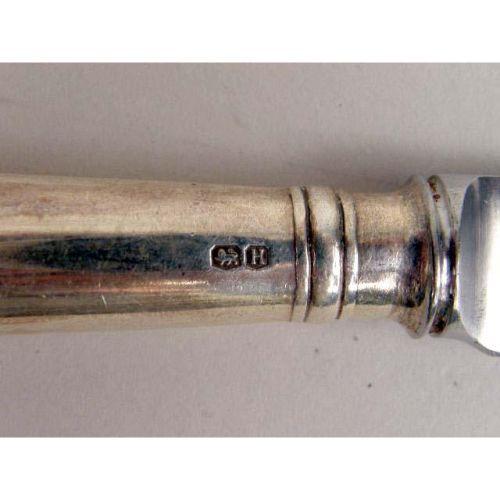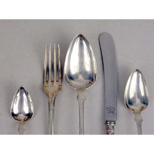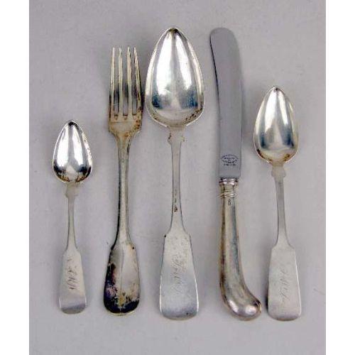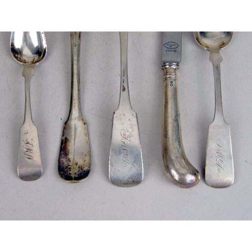 A GROUP OF AMERICAN COIN SILVER FIDDLE-BACK SPOONS<BR><BR>Monogrammed, "FMD", stamped WA Platt, with two symbol maker`s mark flanking a "D", comprising 12 tablespoons, 16 teaspoons, and 18 coffee spoons, together with 2 tablespoons, maker`s mark O.D. Seymour, total weight apx. 48 T.O. with 20 English silver pistol handled dinner knives, hallmarked John Biggin, Sheffield, 1949, and 9 silver plated forks and 7 spoons, 84 pieces