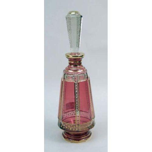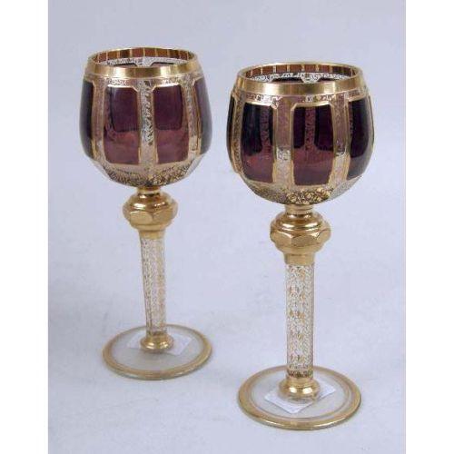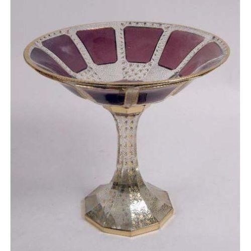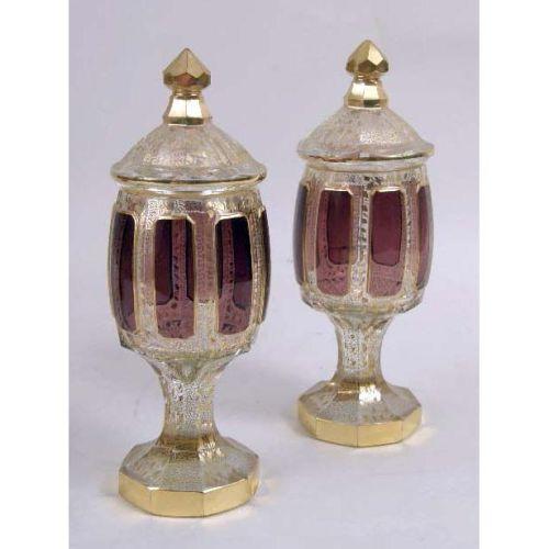 A GROUP OF AMETHYST AND PARCEL-GILT DECORATED GLASS TABLE ARTICLES<BR><BR>Including, a footed compote, two goblets, and two covered jars. Together with a cranberry glass decanter with stopper, wear, 15"h. 6 pieces