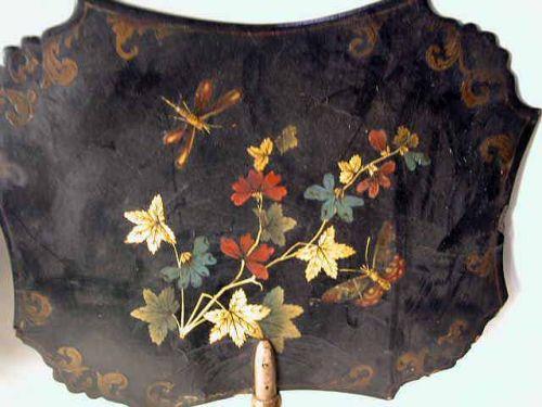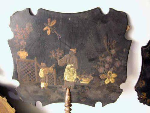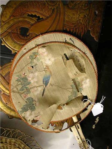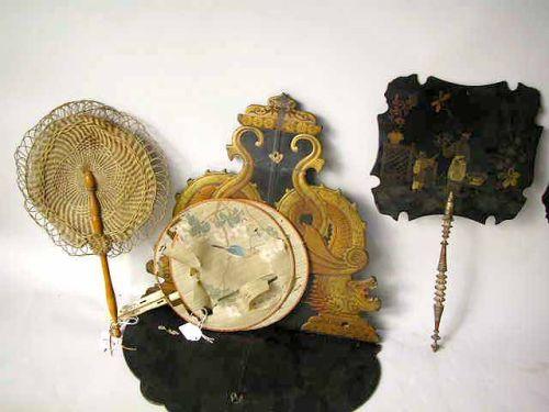 Including a desk blotter, two wall brackets, and a fan. Together with two articulated puppets and three hand fans. Losses and distressed. 9 pieces.