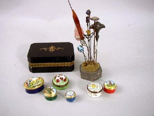 A GROUP OF ASSORTED BATTERSEA PATCH BOXES AND PICTURE FRAMES; together with assorted hat Victorian hat pins. Approximately 20 pieces.