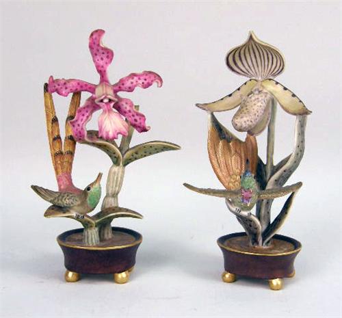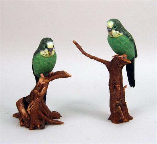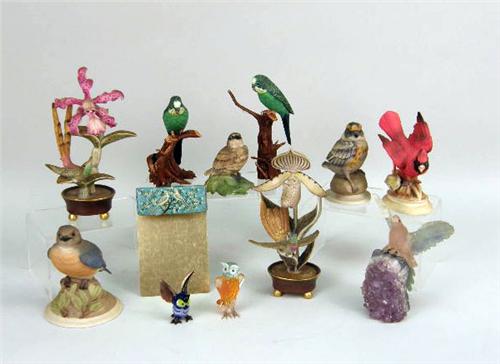 Comprising a Boehm Baby Blue Bird #442, a Fledgling Blackburnian Warbler #478W and a Baby Cedar Waxwing #432L, a pair of Nymphenburg Germany sculptures of exotic birds and orchids, a Japanese figure of a cardinal, two carved wood green parakeets on perches, two glass owls and a rose-and-green-quartz parrot on an amethyst-encrusted geode. Together with an Indian enamel notepad holder painted with two birds on a bough. 12 pieces. The Waxwing with repaired break to base, cardinal missing its top beak, the rose quartz parrot with wings and beak broken off (wing pieces present).