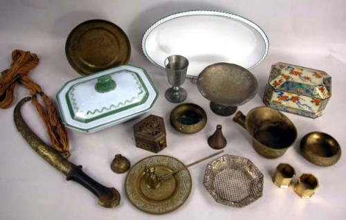 A GROUP OF ASSORTED BRASS AND IRON TABLE ARTICLES;
