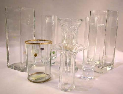 A GROUP OF ASSORTED COLORLESS GLASS TABLE ARTICLES; Including cylindrical and square vases