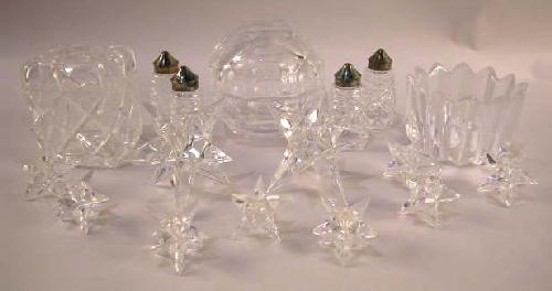 A GROUP OF ASSORTED COLORLESS GLASS TABLE ARTICLES; Including star form candlesticks, salt and pepper shakers, two covered boxes, and a Orrefors bowl
