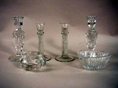 A GROUP OF ASSORTED COLORLESS GLASS TABLE ARTICLES; Including candlesticks, footed compote, creamer, heart shaped dish, inkwell, and sugar bowl
