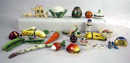 A GROUP OF ASSORTED ENAMEL HINGED BOXES; In the form of fruits and vegetables,