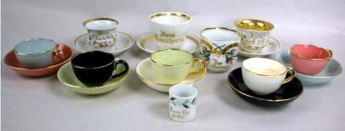 A GROUP OF ASSORTED GILT AND COLOR DECORATED CUPS AND SAUCERS; (losses)