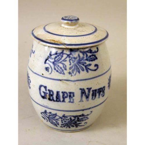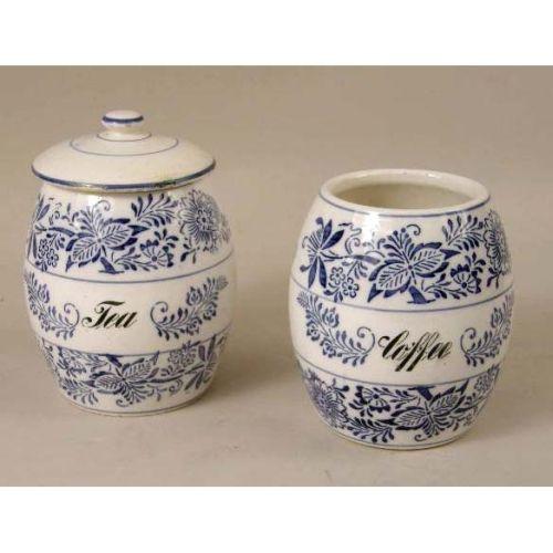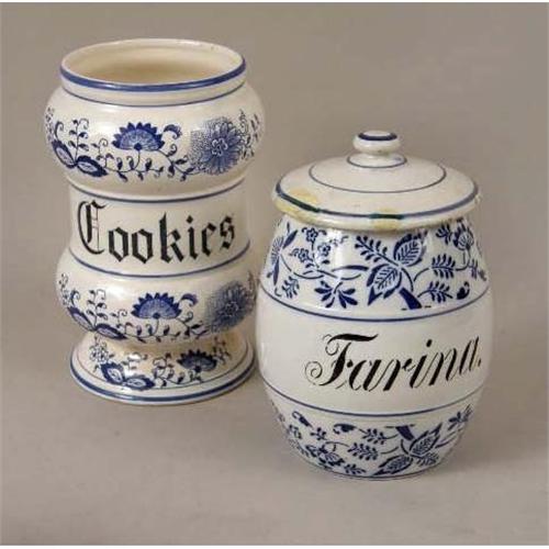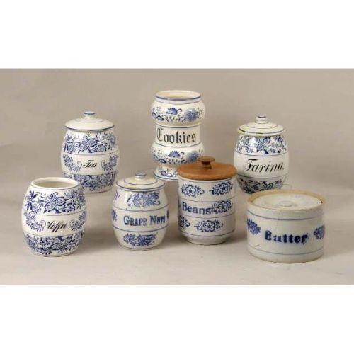 A GROUP OF ASSORTED KITCHEN CANISTERS<BR><BR>most in the Blue Onion pattern. The Farina canister marked "GMT & Bro. / Germany" on the bottom. Three lacking lids, the salt box with losses to one side and bottom. 8 pieces.