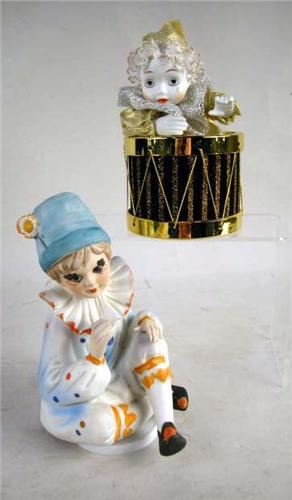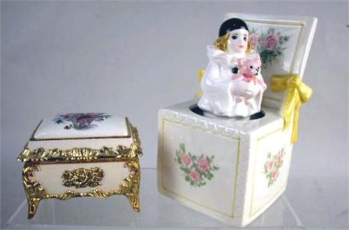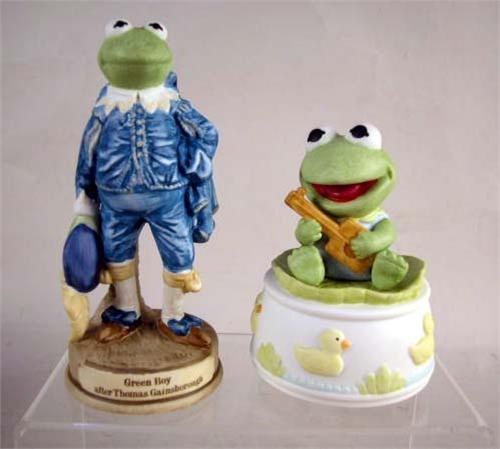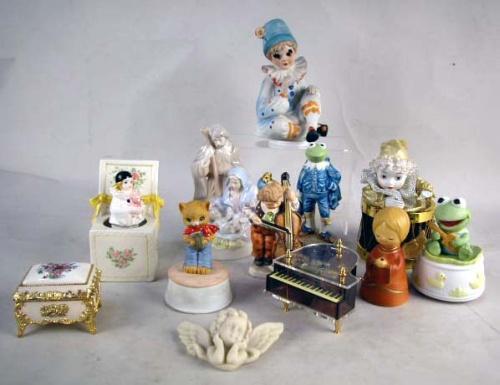 A GROUP OF ASSORTED PORCELAIN FIGURALS Including Kermit the Frog, Jesus, and musical boxes