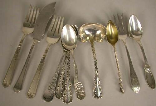 A GROUP OF ASSORTED STERLING SILVER FLATWARE; Comprising: a Whiting Division of Gorham, sauce ladle, a set of five Starr & Marcus patented 1862 teaspoons, a set of five Gorham Princess Patricia dessert forks, a Whiting Division of Gorham Lady Baltimore pattern master butter spreader, a Whiting salad fork, and six miscellaneous teaspoons, apx. 17 T.O.