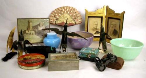 A GROUP OF ASSORTED TABLE ARTICLES; Including, mirrors, boxes, vase, and parasol, (losses)