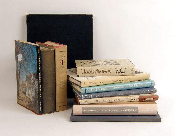 Comprising "The Worlds of Thomas Jefferson: Monticello", "Jefferson`s Buildings at the University of Virginia: The Rotunda", "Thomas Jefferson, Architect and Builder", "The Story of Virginia`s First Century", "The Society of Colonial Dames of America in the State of Virginia, 1892-1930", "Old Virginia Houses: The Piedmont", "Pictorial History of the University of Virginia", "The Restoration of Colonial Williamsburg in Virginia", "Across the Years", "Tidewater Virginia in Color" and an author-signed copy of "Colonial Churches in Virginia", Henry Brock, Dale Press, Richmond,Virginia, 1930, copy #1367/1980. 11 pieces.