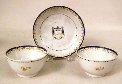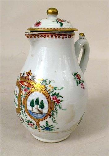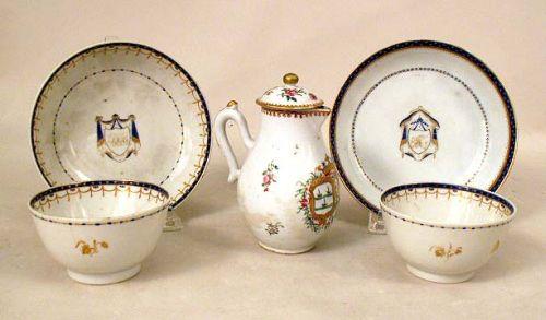 Including two cups and saucers and a covered jug. Cracks and repairs. Tallest 5"h.