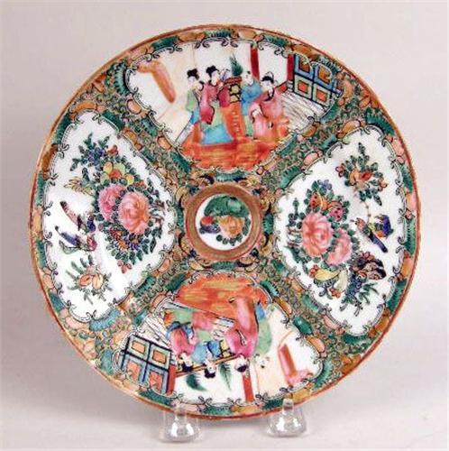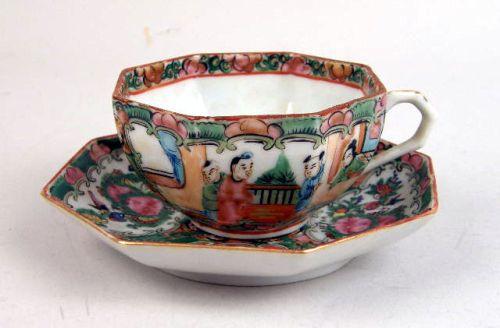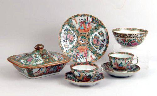 <B>A GROUP OF CHINESE EXPORT ROSE MEDALLION PORCELAIN TABLE ARTICLES</B><BR><BR>Comprising nine lunch plates, two tea cups and three saucers, two hexagonal cups with three matching saucers, a bowl, and a covered dish. 21 pieces. 2 1/4"h x 8 1/2"l x 7"w