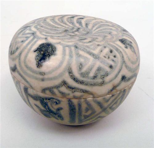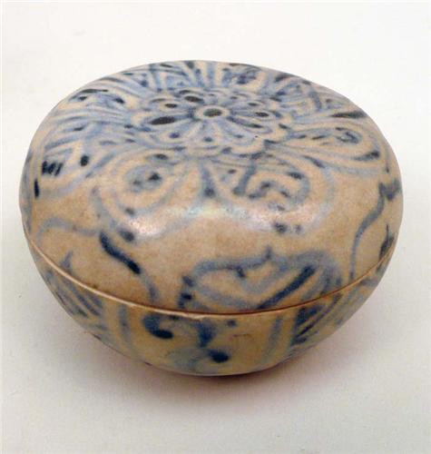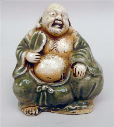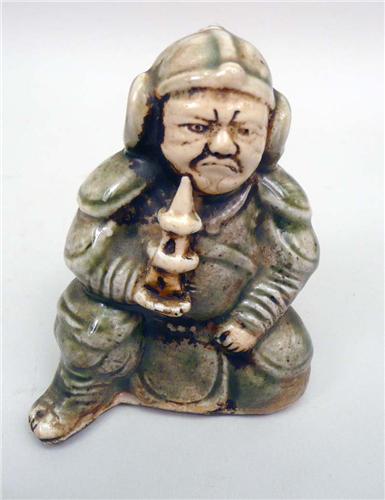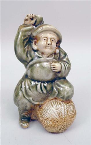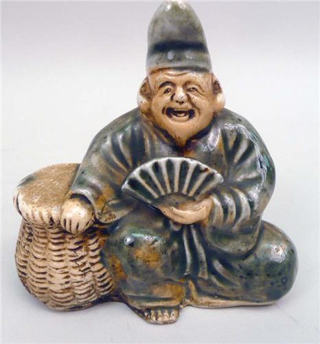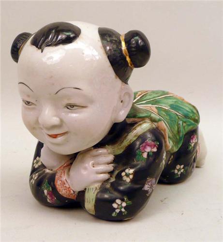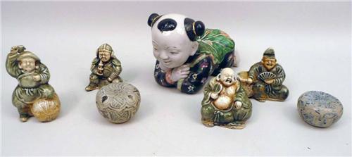 Comprising a head rest in the form of a girl, four figures of men numbered underside 410A-410D, and two small circular covered boxes. 7 pieces. From 4"h to 7"h