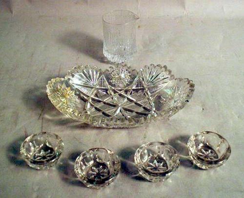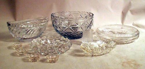 Comprising three bowls, an ashtray, a serving dish, four salts, and a creamer. Largest 10"dia. 10 pieces.
