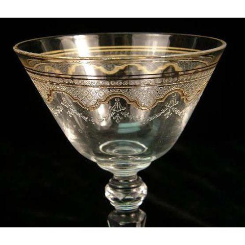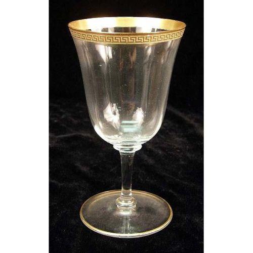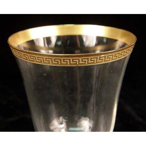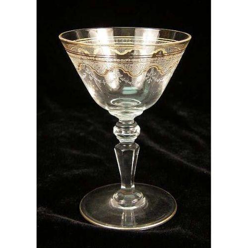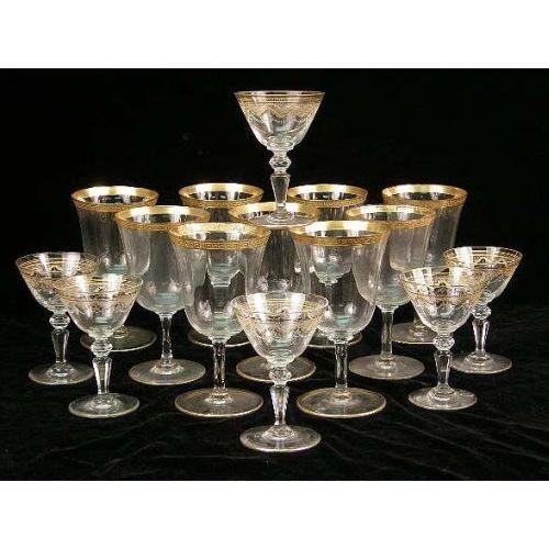 A GROUP OF COLORLESS GLASS AND PARCEL-GILT DECORATED STEMWARE<BR><BR>Including, seven sherry glasses and nine water goblets, chips and wear, 16 pieces