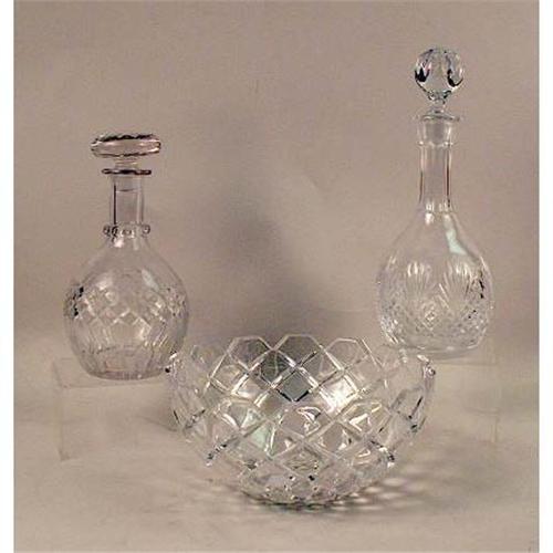 A GROUP OF COLORLESS GLASS TABLE ARTICLES<BR><BR>Including, two decanters, and a circular bowl inscribed Riedel, wear, 9 3/4"dia and 12 1/2"h